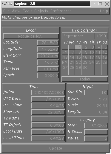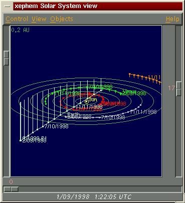CaracterísticasLo mejor, es que se distribuye con bases de datos para miles de objetos, como el PPM, Messier, NGC, aunque desde la página principal de XEphem están disponibles otra serie de catálogos convertidos al formato del programa. Además, nos permite introducir nuevos cuerpos en órbita heliocéntrica o terrestre, incluyendo satélites.Maneja el catálogo de posiciones y movimientos propios (Position and Proper Motion) (PPM) desde un único archivo de disco comprimido de unos pocos mebabytes. Este catálogo llega a la magnitud 10 y es ideal para el uso por parte de los astrónomos aficionados y es recomendable tenerlo disponible en nuestro disco duro. Del resto ya se ocupa el XEphem. Para cálculos de posición podemos obtener la información en coordenadas heliocéntricas, geocéntricas o topocéntricas. Las tablas de datos se pueden generar desde varias ventanas gráficas interactivas incluyendo mapas celeste, de la Tierra, la Luna, Marte, Júpiter, Saturno y el Sistema Solar. Por supuesto, maneja internamente todos los planetas, las lunas de Júpiter, Saturno y la Tierra, la longitud meridiana central de Marte y Júpiter, los anillos de Saturno y la Gran Mancha Roja de Júpiter, algo de gran ayuda para los observadores planetarios, y muestra acercamientos de los sistemas de satélites de Júpiter y Saturno con los objetos de fondo correctos. Tal y como sucede con otros famosos planetarios electrónicos, el XEphem puede servir de control a telescopios robotizados en tiempo real a través de FIFOs de comandos ASCII simples (¿fifos? a leer un manual de UNIX). Una de las mejores virtudes del XEphem con respecto a sus competidores en otras plataformas es la carga de datos a través de la Red. Bien es conocido que el catálogo GSC, con sus 15 millones de estrellas, llega a ocupar un buen bocado de CD-ROM y que traérselo a través de la Red es poco menos que una locura para muchos usuarios. Pues bien, podemos traer trozos del Hubble Guide Star Catalog (GSC) para la vista del cielo actual cuando estemos conectados a Internet. Por si fuera poco este servicio, el XEphem aún nos aguarda con otra notable sorpresa, ya que puede mostrar cartas celestes en formato FITS del Digitized Sky Survey (DSS) superponiendo los símbolos de su base de datos: por fín podremos ver fotos de una región del cielo identificando las galaxias. La información puede calcularse bajo demanda o de forma automática, con un intervalo de tiempo configurable. De esta manera, se pueden generar series de cálculos o animaciones fácilmente... Por que XEphem realiza animaciones, tanto en 2D como en 3D. Las animaciones en 2D las podemos realizar para generar cartas de observación de cometas, mostrando el trazo de su trayectoria para un periodo de tiempo en concreto. Pero además, podemos ver su órbita vista desde fuera del Sistema Solar en 3D, tal y como hace el programa la Danza de los Planetas para MS-DOS. En este caso, SkyMap, ECU, MegaStar y Guide quedan fuera de juego. La información que XEphem brinda de cada objeto incluye AR y Declinación, azimut y altura locales, coordenadas heliocéntricas verdaderas, distancia al Sol y a la Tierra, distancias en tiempo luz, coordenadas galácticas, elongación solar, tamaño angular, magnitud visual, fase (porcentaje iluminado), momento y azimut locales para salida y puesta, momento y altura locales de tránsito, cantidad de tiempo en que el objeto permanece visible, constelación en que se encuentra, y separación angular entre cualquier combinación de objetos. La información local de las circunstancias de observación incluye TU y fecha y hora local, hora sidérea local, hora de crepúsculo y amanecer astronómicos, temperatura y presión atmosféricas locales (para refracción), elevación sobre el nivel del mar (para paralaje), calendario mensual. Los cálculos de AR y declinación pueden ser topocéntricos o geocéntricos, y astrométricos (corregidos sólo por precesión y tiempo de viaje de la luz) o aparentes (corregidos además por nutación, aberración y deflección). Los valores topocéntricos son también corregidos por paralaje y refracción.