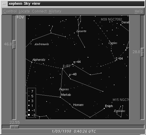 ![]() Ventana del cielo. Con las barras de desplazamiento de los bordes podemos navegar por las coordenadas celestes (ecuatoriales o altazimutales) y seleccionar el campo de visión. Todo es perfectamente configurable.Los archivos de gráficas o listas de los valores de los campos elegidos pueden ser generados a medida que el programa corre. Los archivos de gráficas son valores muy precisos en coma flotante en ASCII, pensados para exportarlos a otros programas graficadores. XEphem incluye una sencilla herramienta para ver rápidamente una gráfica. Los archivos de listas son tablas con un formato más leíble por humanos. XEphem puede leer bases de datos de objetos. Los objetos pueden ser: