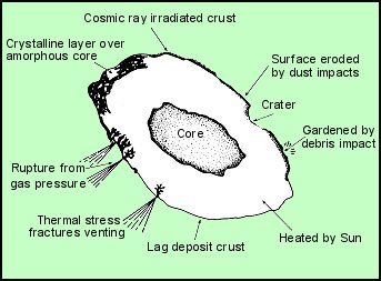 El núcleoLo que más asombra cuando se afronta el análisis de un núcleo cometario es la imposibilidad de su observación directa. Cuando la distancia a nosotros es favorable para una observación fácil, en realidad el núcleo está completamente escondido en la coma que él mismo ha originado. Cuando, por el contrario, la coma está ausente, el núcleo se halla ya a una distancia tal que no puede ser observado debido a sus dimensiones reducidas. Un fenómeno tan majestuoso como la aparición de un cometa no puede resultar más decepcionante.Las dimensiones actualmente estimadas para los núcleos cometarios van desde algunos cientos de metros a algunas decenas de kilómetros. El análisis completo del núcleo del cometa Halley por la sonda Giotto en marzo de 1986 ha hecho posible determinar las medidas en 15 x 7,2 x 7,2 km, evidenciando también una forma altamente irregular. La localización del máximo de actividad del núcleo del Halley (encontrado por las sondas Vega y Giotto), justo en los extremos del elipsoide resultante de excluir la forma irregular del núcleo, puede depender de un mecanismo de sublimación preferencial en ciertas zonas. Es, por lo tanto, preferible pensar que el cometa ha nacido con forma irregular como un aglomerado de fragmentos (Keller y Thomas, 1989). En el modelo más recientemente propuesto para los núcleos cometarios se prevé no una estructura compacta, como la sugerida por Whipple, sino un agregado de fragmentos con el hielo que actuaría como cemento (Mc Sween y Weissman, 1989). Tal descripción está en línea con la hipótesis de la estructura de algunos asteroides (montón de grava) y puede explicar el origen de los fenómenos meteoríticos mediante la dispersión de material cometario en el espacio. Inevitablemente, sin embargo, tenemos que convenir con Taylor (1992) que, en el estado actual, la estructura interna del núcleo cometario es todavía un misterio. Óptimas perspectivas para desvelarlo se ponen en la futura misión espacial Rosetta que analizará in situ el núcleo de un cometa. De gran importancia para la determinación de los parámetros físicos del cometa ha sido, también en este caso, la contribución de las sondas, la primera de todas la Giotto. Ésta ha permitido medir la emisión del núcleo del Halley, cuantificando la de gas en 2 x 107 g/s y la de polvo en 0,3 - 1,0 x 107 g/s. De estos datos se deduce que cada paso por la proximidad del Sol supone la pérdida de alrededor de 1014g. Dado que la estimación de la masa total sugiere un valor de 1017g, podemos aceptar con gran probabilidad sus numerosos pasos (una treintena) minuciosamente registrados en las crónicas históricas. Otro dato extremadamente significativo procurado por las observaciones en la vecindad del núcleo del cometa Halley es su color oscuro: de hecho, refleja sólo un 4% de la luz solar incidente. Continuando con el análisis del núcleo cometario, la figura 3 (Taylor, Solar System Evolution, pag. 124, fig. 3.10.1) esquematiza su estructura de un modo muy significativo y halla confirmación sustancial en las imágenes enviadas a la Tierra por la sonda Giotto. ![]() Representación de un núcleo cometario.Se puede notar los diferentes procesos que han modificado la morfología inicial del cometa: lo más importante, desde el punto de vista observacional, son las fracturas que dejan salir el gas y el polvo destinados a alimentar las estructuras de la coma y de la cola. Una última información importante obtenida en la aproximación de la Giotto (la sonda transitó a una distancia de alrededor de 600 km del núcleo del Halley. Habiendo citado muchas veces la misión Giotto recordemos, por ser precisos, que el primer encuentro de una sonda espacial con un cometa ha sido el del Explorador Cometario Internacional (ICE) el 11 de septiembre de 1985 con el cometa Giacobini-Zinner) es la localización de las zonas de sublimación del gas. Éstas aparecen bien delimitadas localmente y corresponden a una superficie activa evaluable entorno al 10% de la del núcleo. Las modestas dimensiones calculadas para los núcleos cometarios han sido confirmadas también por las observaciones de radar. En el caso de las campañas de la NASA-JPL efectuadas sobre el cometa Hyakutake, ha registrado un núcleo de sólo 1-3 km. De ahí se concluye, dada la intensa actividad manifestada, que la parte de la superficie nuclear activa ha sido superior al 10% de la obtenida para el Halley (Cremonese, 1996). Diferente, sin embargo, es el caso del Hale-Bopp, para el cual, suponiendo una fracción del 10-20% de la superficie como zona activa, lleva a estimar un núcleo de 30-40 km. Estai medida ha sido confirmada por el análisis de la radiación térmica emitida por el núcleo, por las imágenes infrarrojas tomadas por el satélite europeo ISO y a través del análisis del perfil de luminosidad de la coma (de donde se deduce la cantidad de la luz reflejada por el núcleo y de ahí, sus dimensiones). Ya se ha señalado el hecho de que en una revolución se consumiría la reserva interna de hielo a no ser por la imposibilidad de salir del material a causa de la presencia de una corteza protectora. En caso contrario, el aspecto del núcleo no sería muy distinto del de un asteroide y la discriminación entre objetos que pertenecen a las dos clases sería prácticamente imposible (Wetherill e Shoemaker, 1982). Un último aspecto a subrayar, respecto al núcleo de un cometa, se presenta en el análisis de su rotación. En la descripción del modelo de Whipple se había evidenciado que la rotación del núcleo, asociada al efecto cohete, es fundamental para interpretar el movimiento considerado no gravitacional (anticipo y retraso del retorno al perihelio) del cometa. La hipótesis de la rotación del núcleo se basaba inicialmente sólo en argumentos de tipo estadístico (no se conoce ningún cuerpo celeste que no esté dotado de rotación), pero al refinarse las técnicas fotométricas han c