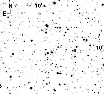 Imagen CCD de BL Lacertae.Un grupo conocido de objetos como BL Lacertae son un tipo de cuásares asociados a una galaxia con una potente radiofuente. El blazar BL Lacertae ha tenido un aumento de brillo muy significativo, incluso se podía observar con telescopios modestos. Los astrónomos profesionales realizaron un llamamiento para observar este objeto en la última semana de agosto y el blazar se comportó con una caída a la magnitud 14, para poco después recuperarse, actualmente sufre unas oscilaciones continuadas formando una curva de luz de dientes de sierra. En la figura 1 representamos la carta de este cuásar que es cortesía de Landessternwarte Heidelberg-Konigstuhl.