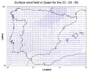 En investigación, el uso de las imágenes meteorológicas es muy importante. En la meteorología terrestre (pero lo mismo se podría decir de la marciana) las imágenes no se utilizan solas, sino que se combinan con otros datos -los mapas de vientos, por ejemplo (figura 3) en los que unos vectores equiespaciados indican la magnitud, dirección y sentido del viento de cada capa de la atmósfera-, y con los productos que se obtienen de las propias imágenes. Y es que la utilidad de tener digitalizada la información es que podemos jugar con ella: una conjunto de 3 imágenes NOAA de diferentes canales, calibradas geométrica y radiométricamente pueden transformarse, mediante los algoritmos adecuados -el split window usualmente- en una carta que nos da la temperatura a 30 cm. del suelo de cuadrados de 1x1 km. Y con esa temperatura y los datos de presión y de humedad que también nos da el satélite podemos establecer un modelo de la circulación atmósferica o estimar, haciéndolo a lo largo de toda una estación, la producción de la próxima cosecha de tomates. El trabajo visual también es útil. Hay verdaderos tratados de interpretación de las imágenes meteorólogicas, en los que se explica como, a partir de los canales térmicos, visibles, infrarrojos y ultravioletas se pueden distinguir tanto los tipos de nubes como los procesos asociados a cada una, la evolución probable que va a seguir una borrasca, y las posibilidades de aguaceros o bajadas súbidas de la temperatura. El método es complicado, y se requiere un buen conocimiento previo de la dinámica atmosférica y de la climatología de las zonas, pero la inclusión de las imágenes de satélite ha supuesto un avance muy importante para esta rama de la Ciencia.