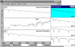 Figura 9. Un diagrama HR ilustrativo, que muestra las estrellas más brillantes y las más cercanas a la Tierra.En la pantalla de clasificación de espectros, seleccionamos cada uno de los espectros que hemos obtenido, y determinamos su clase espectral.